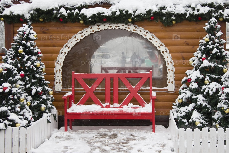 Новогодний пейзаж. Красная скамейка на фоне деревьев и деревянной хижины. Декорации к новому году. Деревянная скамейка для дома елка