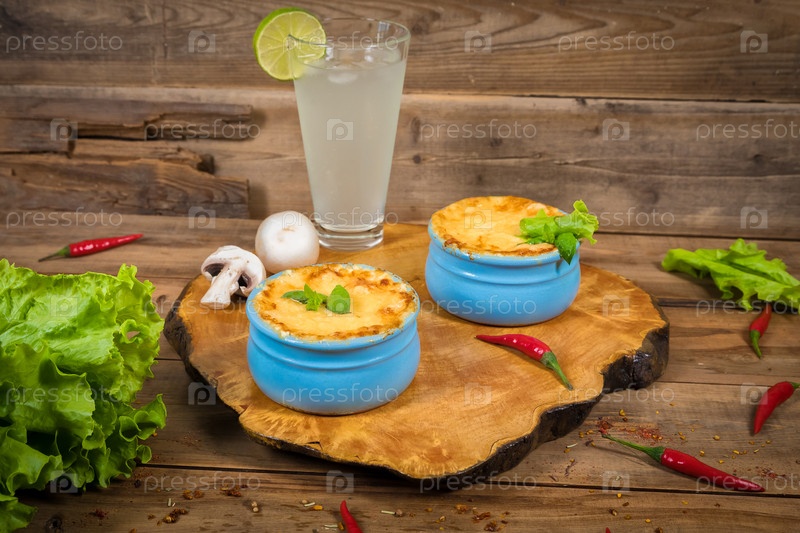 Горшки с жульеном из грибов на деревянной доске