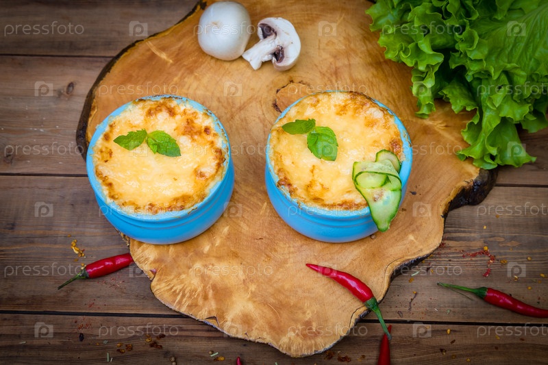 Горшки с жульеном из грибов на деревянной доске