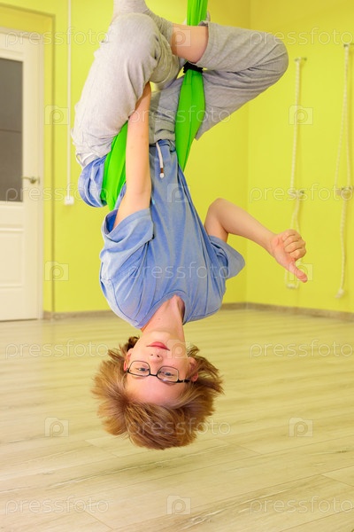 Ребенок занимается йогой в гамаке в зале. Мальчик выполняет асаны в подвешенном состоянии