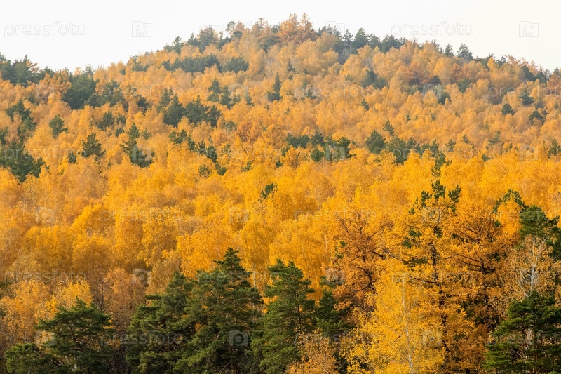 Желтые ели на склоне горы у озера Тургояк. Золотая осень в городе Миасс