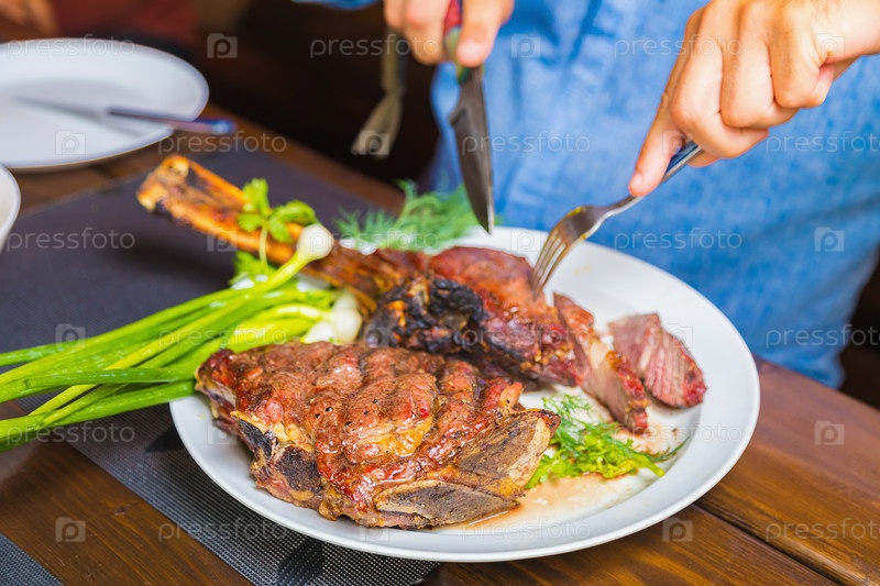 Мужчина режет приготовленное жареное мясо в тарелке. Мясо, запеченное в духовке, на ужин