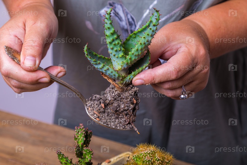 Женщина пересаживает цветок кактуса в небольшой фигурный горшок