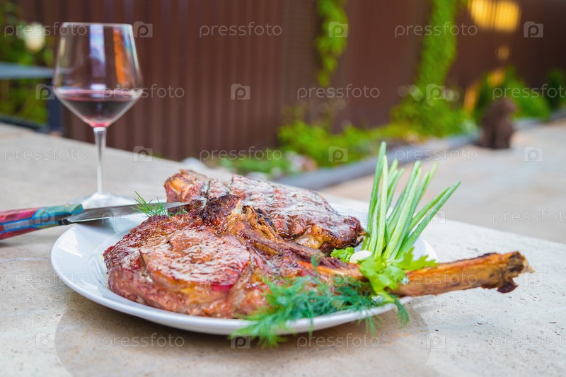Приготовленное жареное мясо со специями на белой тарелке. Мясо, запеченное в духовке, на ужин с бокалом красного вина