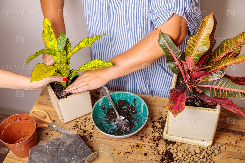 Женщина насыпает землю в новый керамический горшок с пересаженным цветком