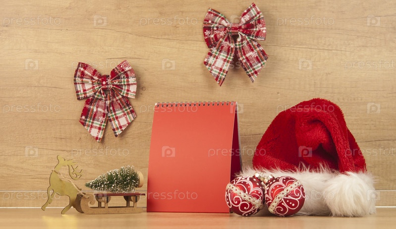 Пустой настольный календарь, шляпа Санты и рождественское украшение. Копировать пространство
