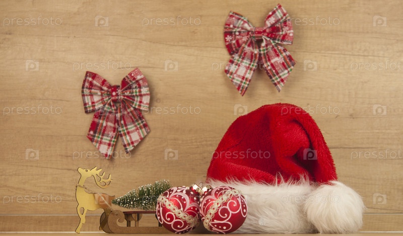 Шляпа Санты и рождественское украшение на деревянной стене. Копировать пространство