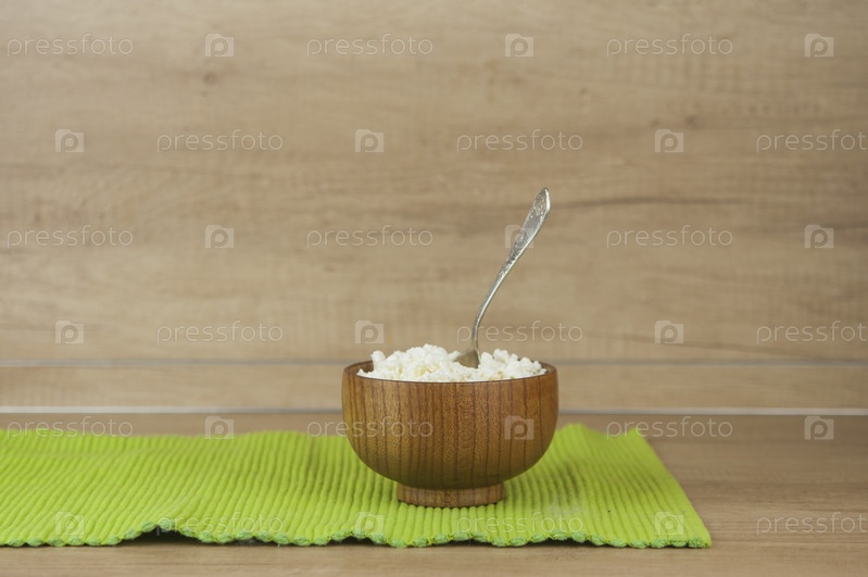 Творог из молочного продукта в коричневой деревянной миске с ложкой на деревянном кухонном столе