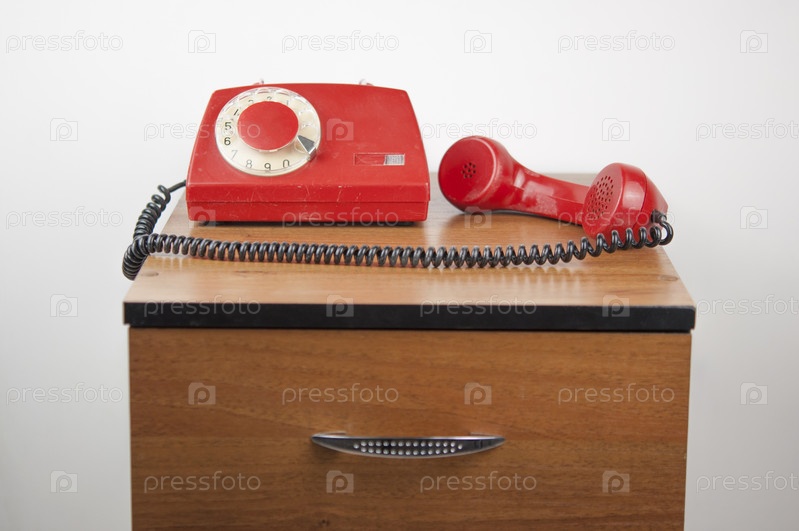 Красный ретро-телефон на деревянной тумбочке