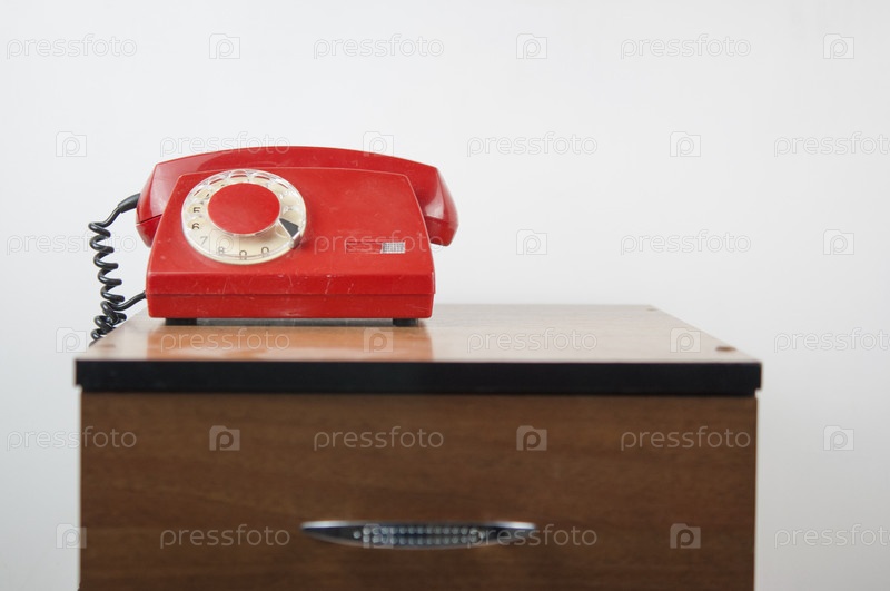 Красный ретро-телефон на деревянной тумбочке