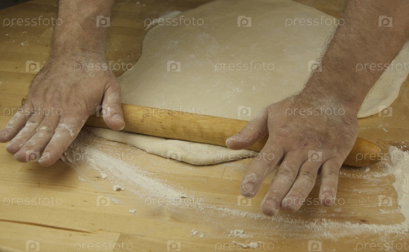Мужские руки месят тесто скалкой в процессе приготовления пиццы