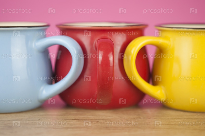 Три красочные чашки на фоне деревянного стола