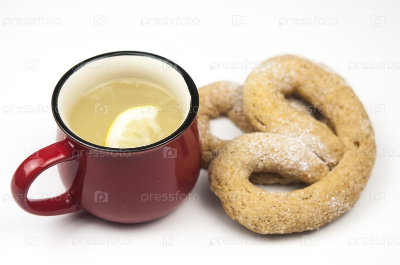 Вкусный горячий чай с медом и лимоном и крендельком на белом фоне