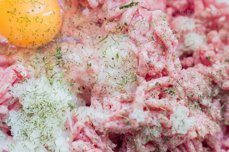 Фарш в миске с сырым яйцом, специями и нарезанным луком для приготовления котлет, выборочный фокус