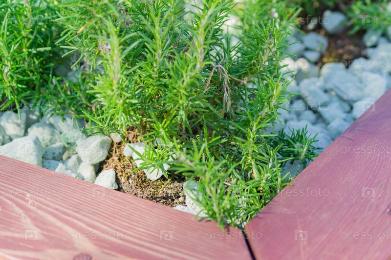 Молодой куст розмарина на садовой клумбе, на открытом воздухе