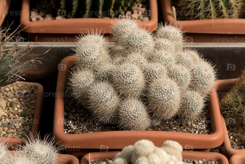 Кактус маммиллярии в цветочном горшке среди других кактусов, естественный фон