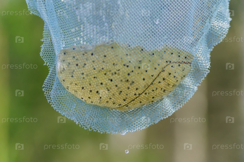 Закройте лягушачью икру в синей сетке. Очистка пруда