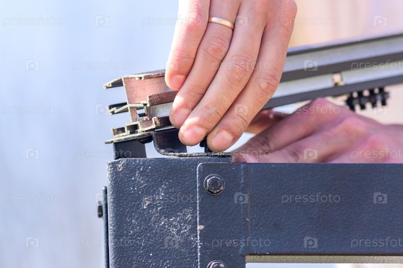 Ручной рабочий собирает части металлического каркаса вместе