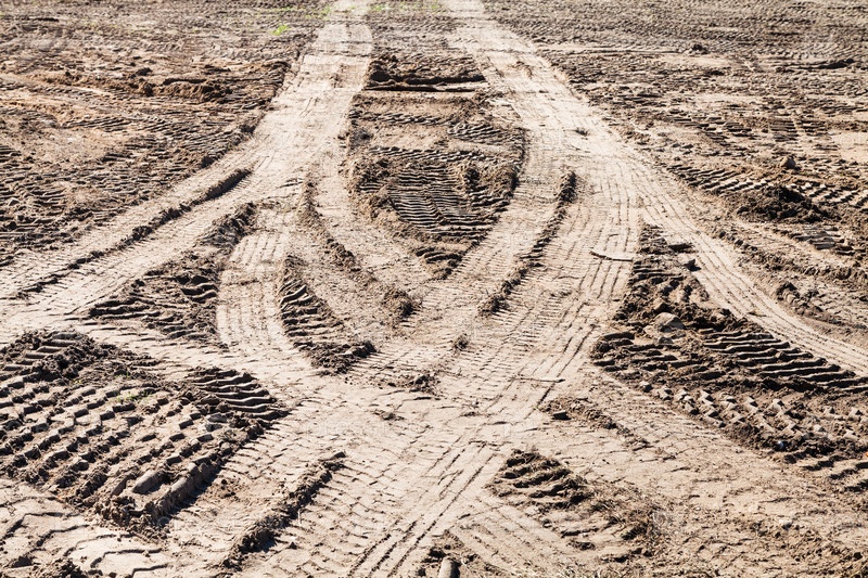Симметричные следы автомобильных шин на грязном поле