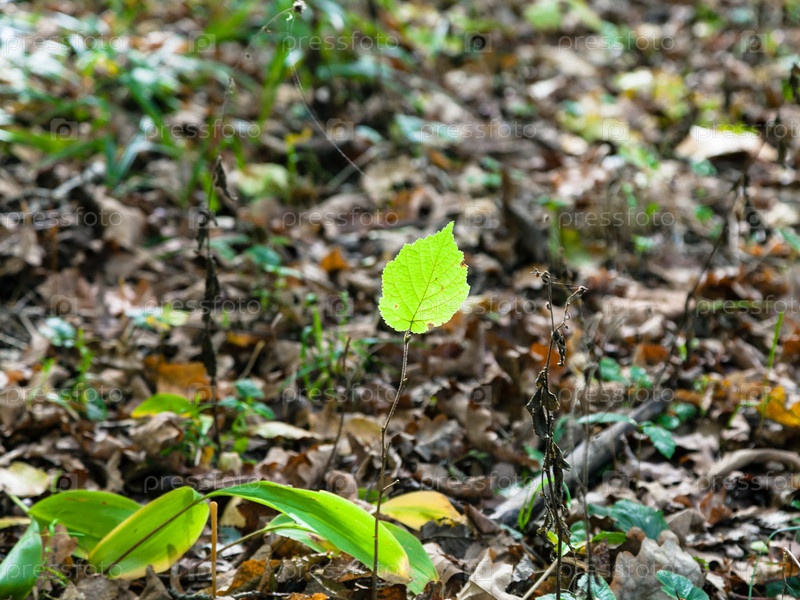 Зеленый лист ростка в осенней лиственной подстилке
