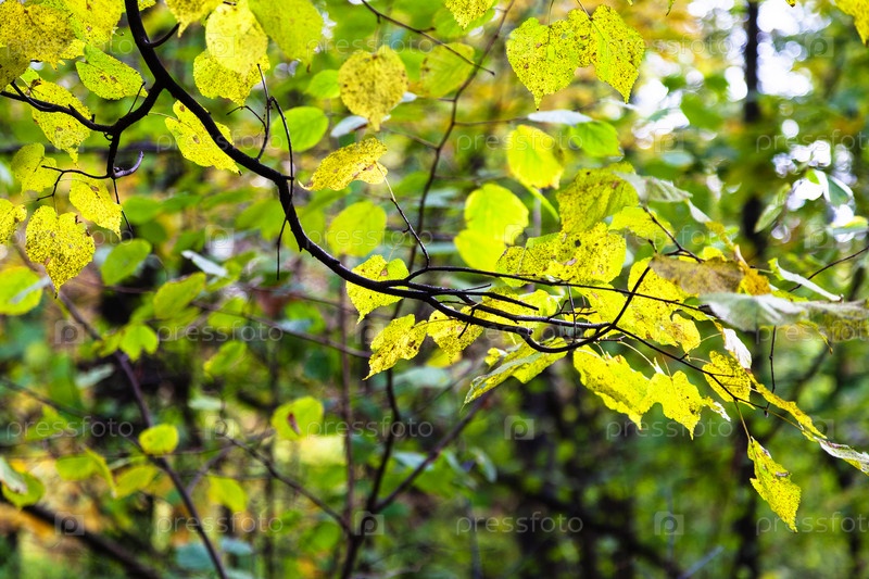 Зеленые и желтые листья, освещенные солнцем