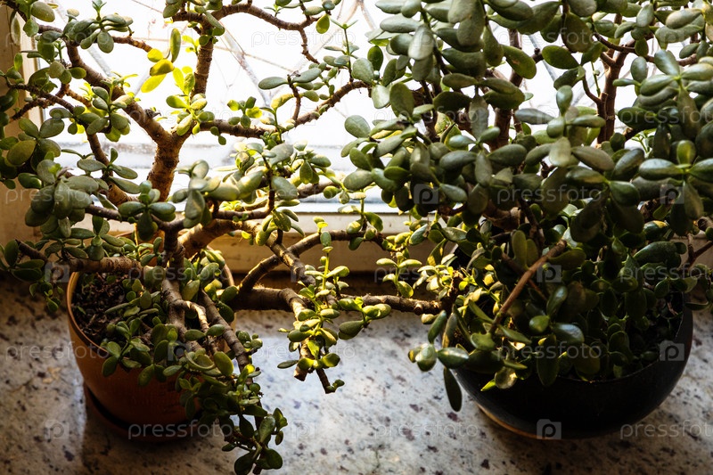 Комнатные растения на гранитном подоконнике, освещенном солнцем