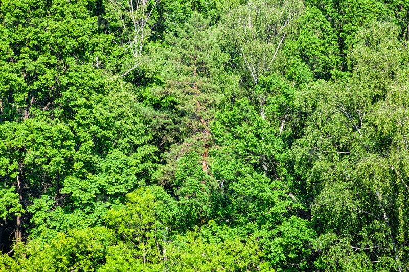 Густой зеленый лес в солнечный летний день