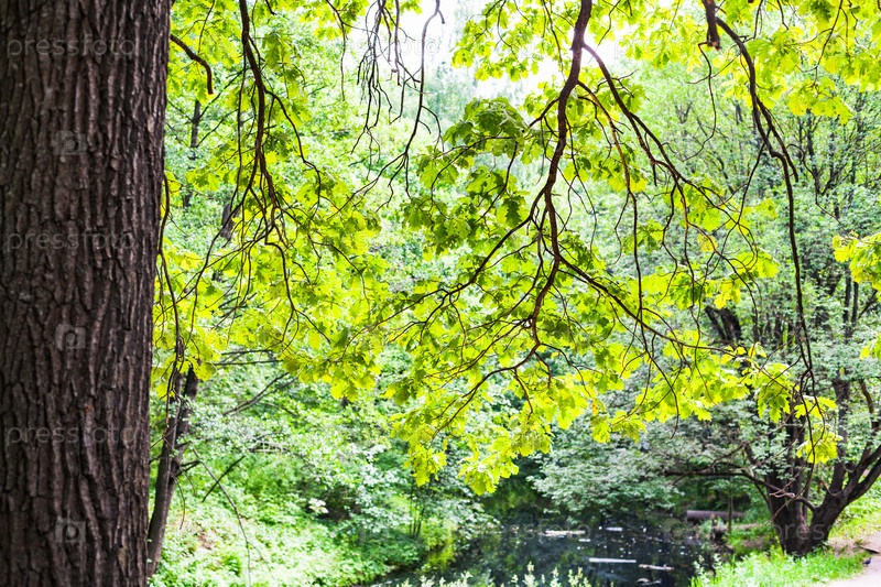Дуб, освещенный солнцем над лесной рекой в городском парке