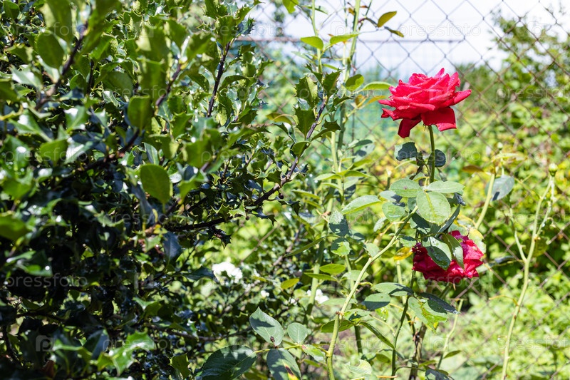 Мокрые натуральные цветы розы возле сетчатого забора