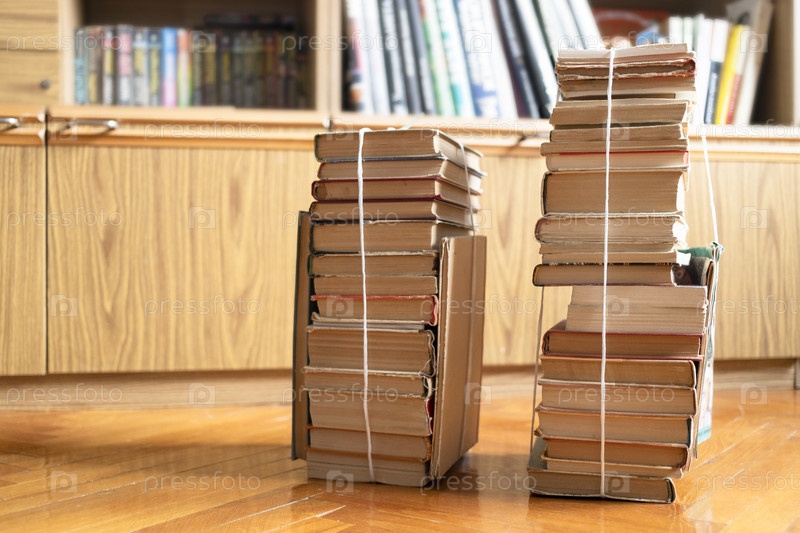 Две стопки использованных книг, перевязанные ниткой