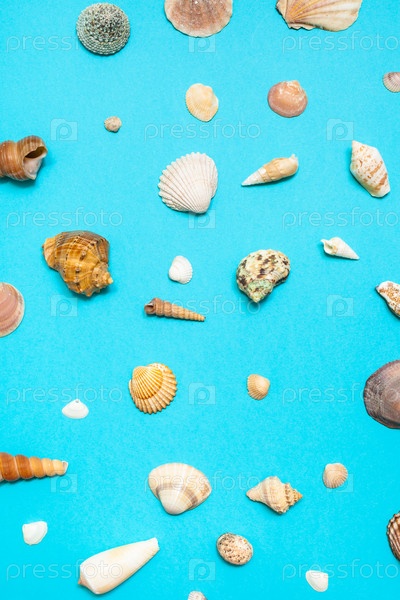 Вид сверху на многие натуральные сушеные морские раковины на голубом