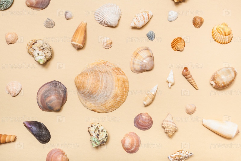 Коллаж из натуральных сушеных морских раковин на желтом