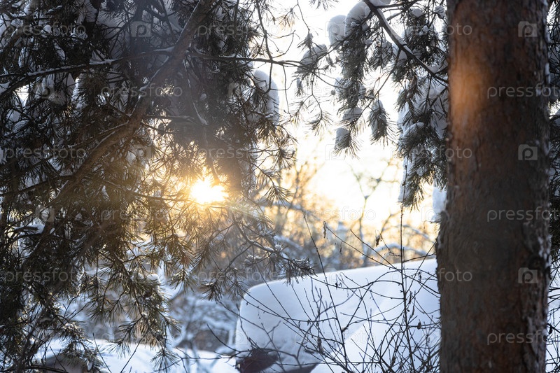 Залитая солнцем снежная сосна на заднем дворе