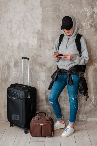 Хипстерская девочка-подросток с чемоданами на фоне бетонной стены в зале ожидания транспорта