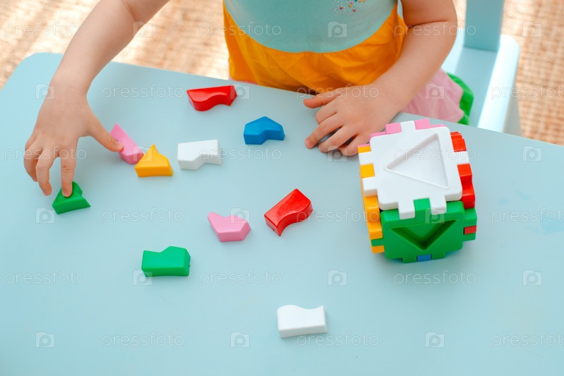 Крупным планом руки ребенка собирают сортировщик головоломок. Куб со вставленными геометрическими фигурами и цветными пластиковыми блоками. Развивающая детская игровая игрушка
