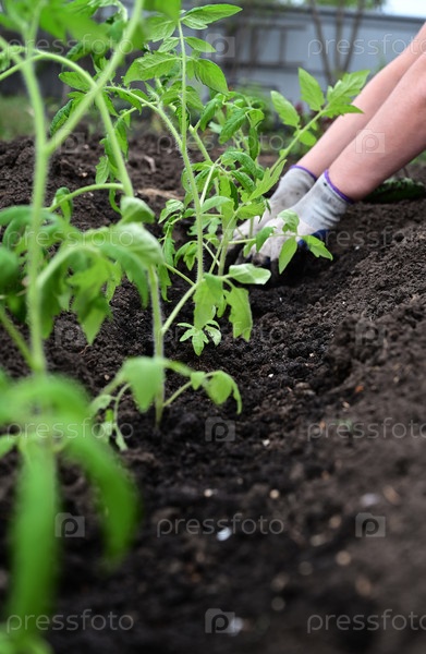 Рука подкладывает землю под зеленый помидорКонцепция ухода за растениями и выращивания органических продуктов