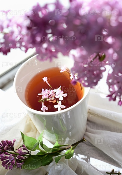 Открытка красивая. Кружка чая, старая книга и букет фиолетовой сирени. Красивый натюрморт. Весеннее время. Концепция доброго утра