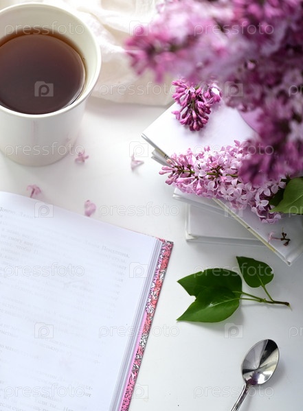 Открытка красивая. Кружка чая, старая книга и букет фиолетовой сирени. Красивый натюрморт. Весеннее время. Концепция доброго утра