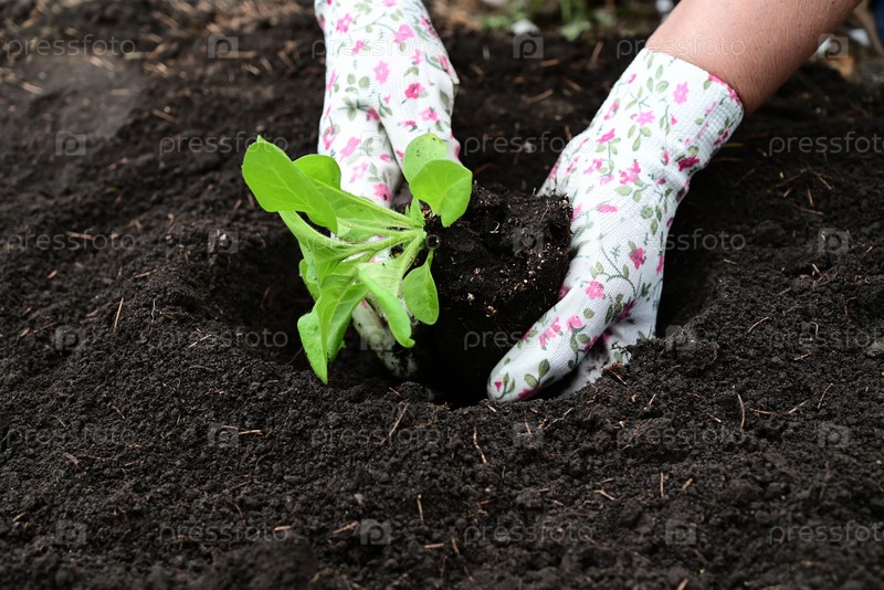Рука кладет землю под петунию Концепция ухода за растениями и выращивания органических продуктов