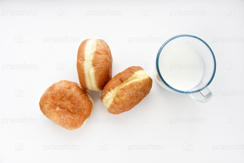 Вкусные сладкие булочки с вареньем и стаканом молока на белом фоне. Вкусный завтрак из красиво обжаренных булочек и молока