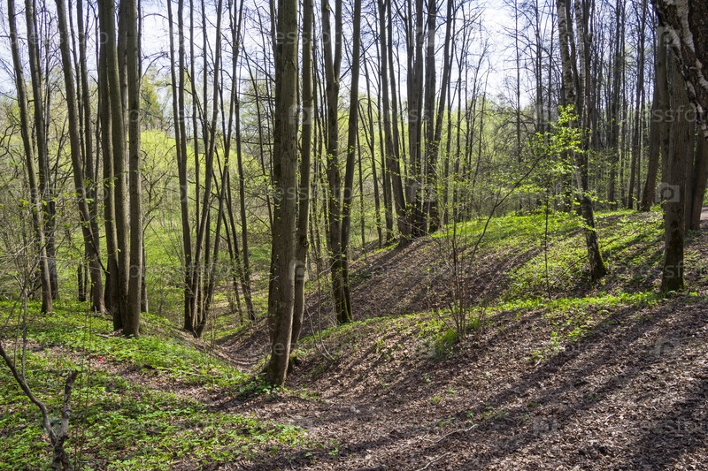 Небольшой овраг в весеннем лесу. Лесопарк Узкое, Москва. Солнечный день в начале мая