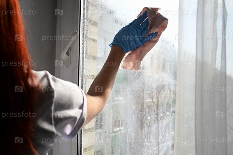 Очистка оконного стекла моющим средством, концепция весенней уборки