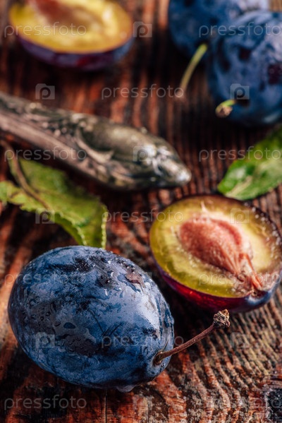 Спелые сливы с листьями, каплями воды и ножом
