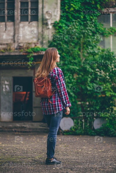 Молодая женщина стоит перед старым зданием