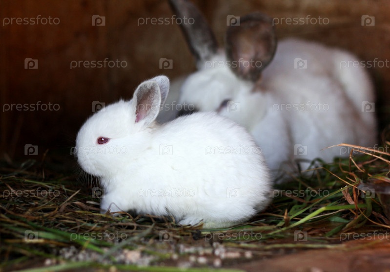 Маленький пушистый белый кролик и мама-крольчиха сидят в гнезде