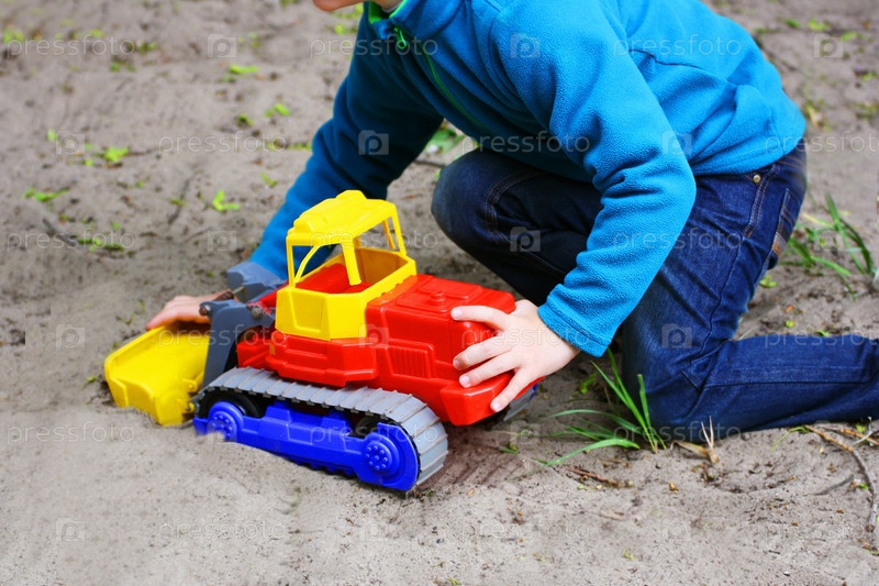 Ребенок играет на песке с игрушечной машинкой