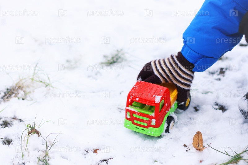 Часть образа ребенка, играющего среди первого снега с красной машинкой