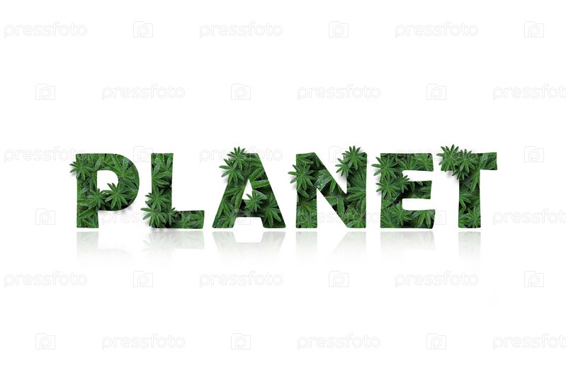 Английское слово 'planet' стилизовано под коллаж из фотографий листьев люпина.Слово со зеркальным отображением, выделенное на белом фоне