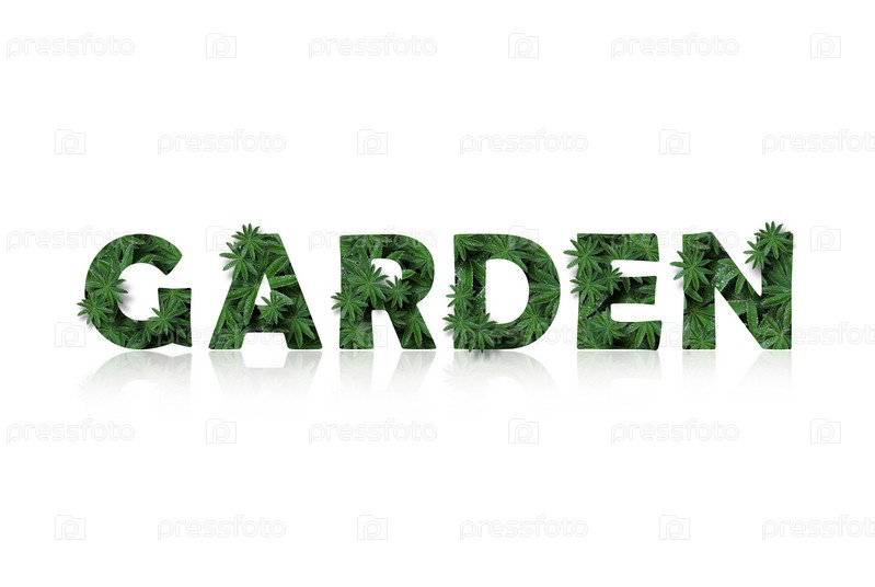 Английское слово 'garden' стилизовано под коллаж из фотографий листьев люпина.Слово со зеркальным отображением, выделенным на белом фоне