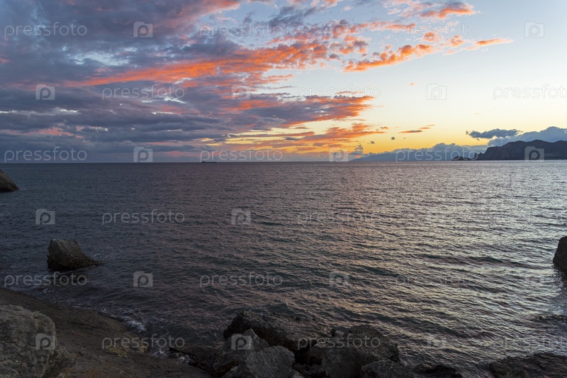 Облака над морем, красиво подсвеченные закатным солнцем. Крым, сентябрь